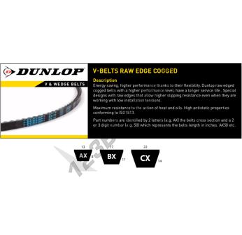 Der Riemen AX41-DUNLOP der Familie von Keilriemen Gezahnt, Marke DUNLOP, und Profil AX. Es hat einen 13mm x 8mm mit einer internen Länge 1041 mm, einer externen Länge 1091 mm, und einer primitiven Länge 1071 mm.