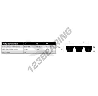 Der Riemen 3-3V1250 der Familie von Mehrsträngige Keilriemen, Marke Generisches, und Profil 3V. Es hat einen 9.65mm x 7.8mm mit einer internen Länge mm, einer externen Länge mm, und einer primitiven Länge mm.