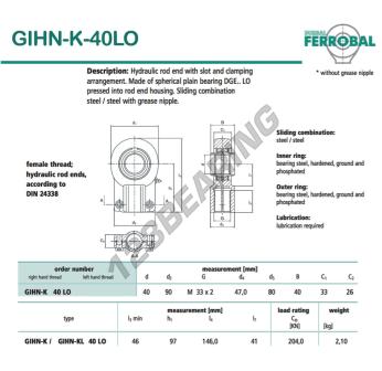 Das Gelenklager Ge bekannt als GIHN-K-40LO-DURBAL DURBAL hat einen Innendurchmesser von 40 mm, einen Außendurchmesser von 90 mm und einer Dicke von 33 mm.