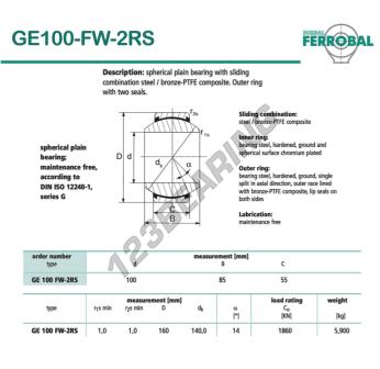 Das Gelenklager Geew bekannt als GE100-FW-2RS-DURBAL DURBAL hat einen Innendurchmesser von 100 mm, einen Außendurchmesser von 160 mm und einer Dicke von 55 mm.