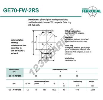 Das Gelenklager Geew bekannt als GE70-FW-2RS-DURBAL DURBAL hat einen Innendurchmesser von 70 mm, einen Außendurchmesser von 120 mm und einer Dicke von 45 mm.