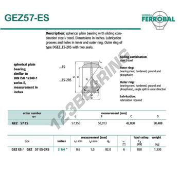 Das Gelenklager Geew bekannt als GEZ57-ES-DURBAL DURBAL hat einen Innendurchmesser von 57.15 mm, einen Außendurchmesser von 90.488 mm und einer Dicke von 42.85 mm.