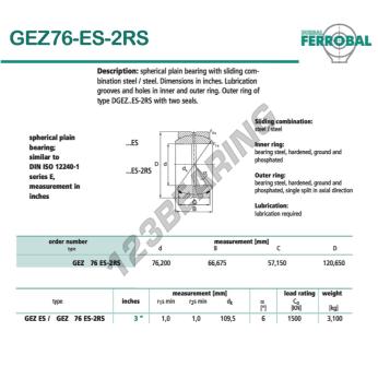 Das Gelenklager Geew bekannt als GEZ76-ES-2RS-DURBAL DURBAL hat einen Innendurchmesser von 76.2 mm, einen Außendurchmesser von 120.65 mm und einer Dicke von 57.15 mm.