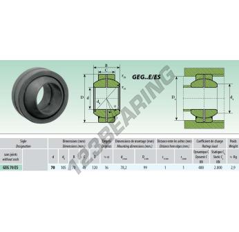 Das Gelenklager Geg bekannt als GEG070-ES Generisches hat einen Innendurchmesser von 70 mm, einen Außendurchmesser von 120 mm und einer Dicke von 70 mm.