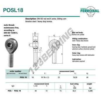 Die Gelenkkopf Sa bekannt als DPOSL18-DURBAL DURBAL, hat eine Gewindesteigung von , einen Innendurchmesser von 18 mm, einen Außendurchmesser von 44 mm und eine Dicke von 23 mm.