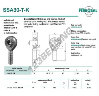 Die Gelenkkopf Sa bekannt als DSSA30-T-K-DURBAL DURBAL, hat eine Gewindesteigung von , einen Innendurchmesser von 30 mm, einen Außendurchmesser von 70 mm und eine Dicke von 37 mm.