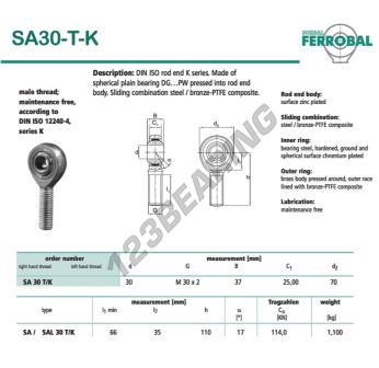 Die Gelenkkopf Sa bekannt als SA30-T-K-DURBAL DURBAL, hat eine Gewindesteigung von , einen Innendurchmesser von 30 mm, einen Außendurchmesser von 70 mm und eine Dicke von 37 mm.