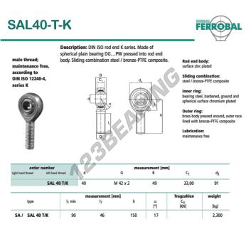 Die Gelenkkopf Sa bekannt als SAL40-T-K-DURBAL DURBAL, hat eine Gewindesteigung von , einen Innendurchmesser von 40 mm, einen Außendurchmesser von 91 mm und eine Dicke von 49 mm.