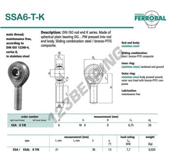 Die Gelenkkopf Sa bekannt als SSA6-T-K-DURBAL DURBAL, hat eine Gewindesteigung von , einen Innendurchmesser von 6 mm, einen Außendurchmesser von 20 mm und eine Dicke von 9 mm.