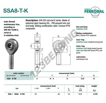 Die Gelenkkopf Sa bekannt als SSA8-T-K-DURBAL DURBAL, hat eine Gewindesteigung von , einen Innendurchmesser von 8 mm, einen Außendurchmesser von 24 mm und eine Dicke von 12 mm.