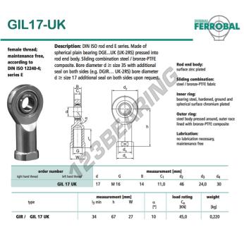 Das Gelenkköpfe Si bekannt als GIL17-UK-DURBAL DURBAL hat einen Innendurchmesser von 17 mm, einen Außendurchmesser von 46 mm und einer Dicke von 14 mm.