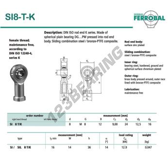 Das Gelenkköpfe Si bekannt als SI8-T-K-DURBAL DURBAL hat einen Innendurchmesser von 8 mm, einen Außendurchmesser von 24 mm und einer Dicke von 12 mm.