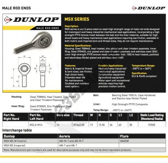 Die Gelenkköpfe Tsm bekannt als MSLX-M14-DUNLOP DUNLOP, hat eine Gewindesteigung von , einen Innendurchmesser von 14 mm, einen Außendurchmesser von 19 mm und eine Dicke von 13.5 mm.