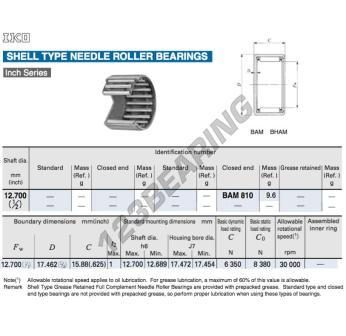 Das Nadelhülsenlager, bekannt als BAM810-IKO IKO, hat einen Innendurchmesser von 12.7 mm, einen Außendurchmesser von 17.46 mm und eine Dicke von 15.88 mm.