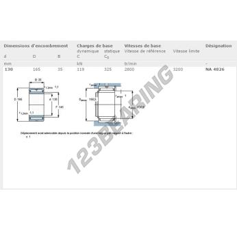 Das Axial-nadellager , bekannt als NA4826-SKF SKF, hat einen Innendurchmesser von 130 mm, einen Außendurchmesser von 165 mm und eine Dicke von 35 mm.