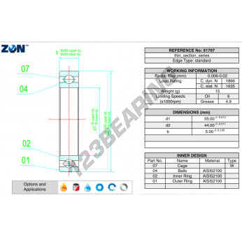 Das Rillenkugellager, bekannt als 61707-ZEN ZEN, hat einen Innendurchmesser von 35 mm, einen Außendurchmesser von 44 mm und eine Dicke von 5 mm.