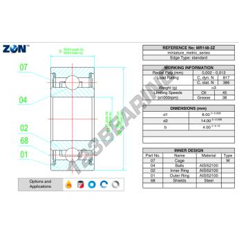 Das Rillenkugellager, bekannt als MR148-2Z-ZEN ZEN, hat einen Innendurchmesser von 8 mm, einen Außendurchmesser von 14 mm und eine Dicke von 4 mm.