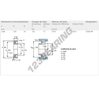 Das Pendelkugellager, bekannt als 1322-M-SKF SKF, hat einen Innendurchmesser von 110 mm, einen Außendurchmesser von 240 mm und eine Dicke von 50 mm.
