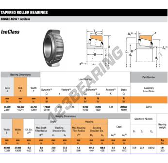 Das Kegelrollenlager, bekannt als 32213-TIMKEN TIMKEN, hat einen Innendurchmesser von 65 mm, einen Außendurchmesser von 120 mm und eine Dicke von 32.75 mm.