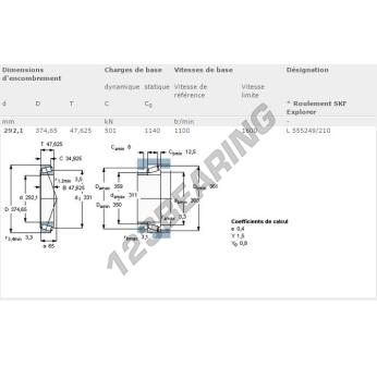 Das Kegelrollenlager, bekannt als L555249-L555210-SKF SKF, hat einen Innendurchmesser von 292.1 mm, einen Außendurchmesser von 374.65 mm und eine Dicke von 47.63 mm.