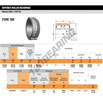 Das Kegelrollenlager, bekannt als LM282549D-LM282510-TIMKEN TIMKEN, hat einen Innendurchmesser von 708.25 mm, einen Außendurchmesser von 930.275 mm und eine Dicke von 273.05 mm.