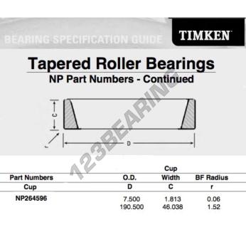 Das Schüssel, bekannt als NP264596-TIMKEN TIMKEN, hat einen Innendurchmesser von mm, einen Außendurchmesser von 190.5 mm und eine Dicke von 46.038 mm.