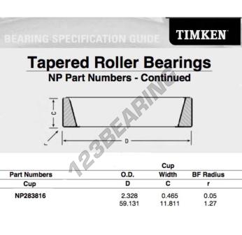 Das Schüssel, bekannt als NP283816-TIMKEN TIMKEN, hat einen Innendurchmesser von mm, einen Außendurchmesser von 59.131 mm und eine Dicke von 11.811 mm.
