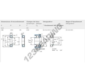 Das Rollenlager, bekannt als NJ314-ECJ-SKF SKF, hat einen Innendurchmesser von 70 mm, einen Außendurchmesser von 150 mm und eine Dicke von 35 mm.