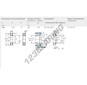 Das Rollenlager, bekannt als NU320-ECM-SKF SKF, hat einen Innendurchmesser von 100 mm, einen Außendurchmesser von 215 mm und eine Dicke von 47 mm.