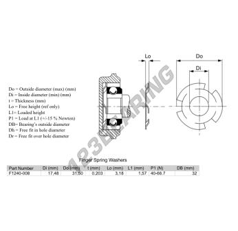 Das Federscheiben Für Kugellager mit der Referenz F1240-009 hat einen Innendurchmesser von 17.48 mm, einen Außendurchmesser von 31.5 mm und eine Dicke von 0.203 mm.